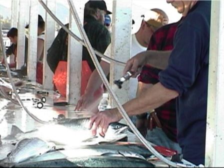 うろこを包丁でそぎ落とした後、水シャワーで魚を綺麗にする。