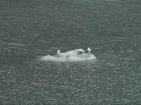 海にプカプカ浮かぶ氷にカモメが4羽。乗りごこちはどう?