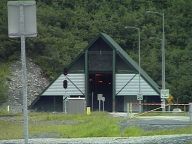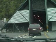 AAMトンネルを通過。ビデオカメラを車のダッシュボードに乗せて撮影。臨場感があってなかなか面白い。トンネルは鉄道と兼用なので、車は線路の上を通る。ちょうど踏み切りの上を走る感じかな。縦長のゴツゴツした岩肌のトンネルは、けっこう距離が長い.25マイル(40キロ)で5分ほど走ってようやく出口へ。