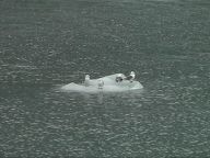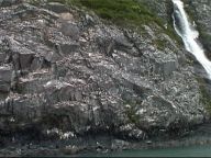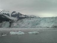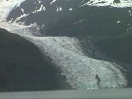 | で、肝心の氷河。最初に訪れたハーバード氷河はものすごく大きい。大きすぎてビデオの画面に収まりきらない。昨日のものの比じゃないね。しかし曇り空のせいか、崩れない。みんなで大きな声を出したが、ビクともしない。氷河の前にはアザラシが寝そべっていた。日本語ガイドさんの「ソーセージのように」という表現がピッタリ。 次に訪れた2つの氷河も、これまたビッグ。しかし崩れない。かなり粘ったが崩れない。悲しい(泣)