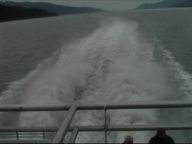 | 食べ物を乗せ忘れ、ひき返すハプニングがあったものの、1:00出港。このクルーズは日本人がとても多い。全乗客のうち、3分の1ぐらいを占めていて、船内のアナウンスは英語と日本語になっている。だいたい50代以上の年配の方々が多いね。 この船は高速船で、時速50マイル(80キロ)までスピードが出る。にもかかわらず、昨日の小船と違って、まったく揺れない。まるで道路の上を走っているようだ。外に出て後ろを見ると、ジェット噴射のように水しぶきが上がっている。船はフネでも、いろんな体験が出来て面白いね。