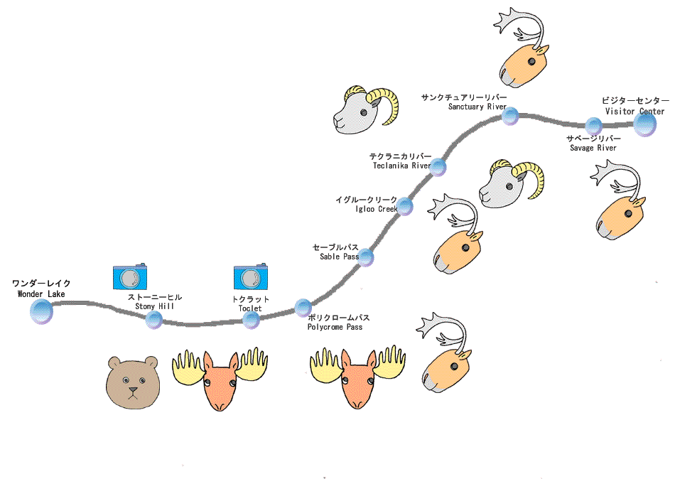 (ex.カリブー3 PM 左側 セーブルパス = 午後セーブルパスで、進行方向左側にカリブー3頭)