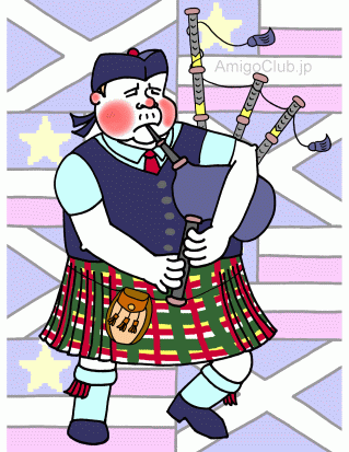 バグパイプを吹く太めのおじさん。丸太のようなスカートが素敵。
