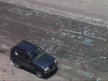 ミラドール観測塔の真下の道路には、落書きがたくさん。