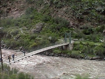 濁流の上にかかる吊り橋。そして、その上を渡るトレッカー。