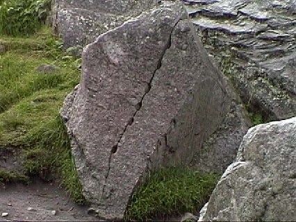 @石くいで、石に切り込みを入れる。A木くいを水で濡らして切り込みに差し込む