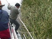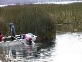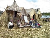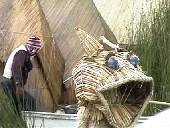 | 細長いトトラという船に、バランス良く左右均等に乗る。周りはとても静か。船をこぐ音、話し声しか聞こえない。素晴らしい。 別の島に到着、料金を払う。5ソル硬貨を出すと、お兄さん「これ、ニセモノだよ」なんですと〜?ガイドさんに違いを聞いた。@色 A模様が雑 B素材(指で擦るとツルツルになる)ニセ金なんて初めて見た。嬉しいのやら、悲しいのやら。記念にとっておこう。