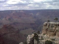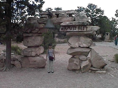 ハーミッツ・レスト"Hermits Rest"(西の端)*** Larry ***バスに乗ってハーミッツ・レストに向かう。途中、排気ガスで枯れた木々がつづく。1時間ほどバスにゆられて到着。しかし、風景はブライト・エンジェル・ポイントとほとんど変わらない。疲れただけだった(泣)。 *** Miki *** その名の通り、トイレ休憩。ここのトイレは、すごくワイルド。ためらったが満タンだったので、つま先立って用足し。