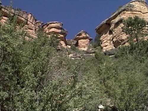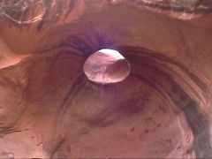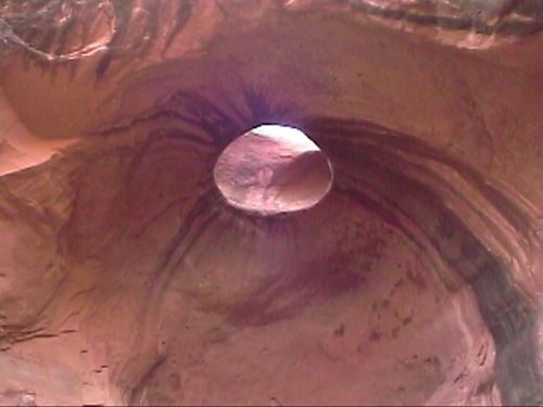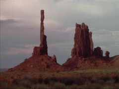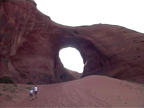 ツアーでしか行けない地域*** Larry ***一般車は進入できない地域に突入だ(感激)。ここにはいろいろなアーチがある。しかし、ビジターセンターで見た風景ほどの感動はない。 トーテム・ポールは遠くから見るだけで、接近してくれなかった(泣)。真下からトーテムポールを見上げるのが俺の夢だったのに・・・ *** Miki *** 素人が運転したらすぐ埋まりそうな悪路を進む。 ビッグホーガンは、インディージョーンズの撮影に使われたところ。 ガイドさんが、雨水が垂れた跡を指差し、「イーグル(鷲)」と教えてくれたが、 私には手塚治の「火の鳥」に見えた。彼女に説明できない私の英語力が情けない(苦笑)。