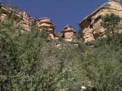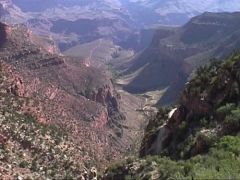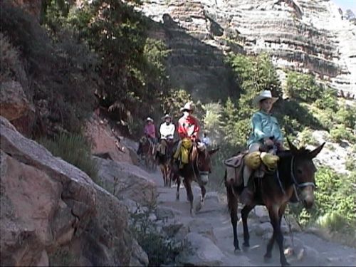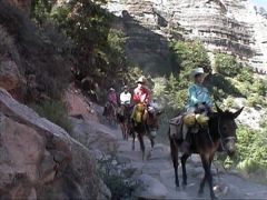 ブライト・エンジェル・トレイル"Bright Angel Trail"*** Larry ***朝食後、違った角度から風景を楽しもうとトレイルを歩いて降りていく。やはり正解だ。上から見下ろすのとは違う世界が見えてくる。 トレイルにはミュール(ロバと馬の合いの子)に乗って降りていくツアー客もいる。楽そうでいいなー。 下界まで行きたいが時間がないので引き返す。 *** Miki *** 2時間ほど渓谷を下から見上げた。上から見下ろすのとは風景が違っていて面白い。 ラバ(馬Xろば)のう●こを避けながら歩くトレイルも、なかなかオツよ。