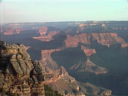 マーサー・ポイント"Mather Point"(日の出)*** Larry ***やっと眠れたと思ったら4時にセットした目覚ましが鳴る。5時16分の日の出を見る為といえ、ちょっとつらい。 日の出30分前にマーサー・ポイントに到着。それほど人は集まっていない。しかし、日の出の頃にはうじゃうじゃ。日本人いっぱい。 日の出を見るとほとんどの人が帰ってしまった。しかし、本当に綺麗な風景はそれからだった。 手前の岩が光だし、どんどん地形に影が付き始める。「日の出」20分後には信じられないほど綺麗な風景が見られた。 グランドキャニオンに来てこれを見ないなんてもったいない話だ。 *** Miki *** 日の出30分前に現地へ。圧倒的に日本人が多いのは、日の出に対する意識の違いかな? 渓谷は、太陽が昇るにつれて、刻々と表情が変わる。 日の出20分後には、パンフ、マグカップなどで良く見る風景になった。もちろん、実物は迫力が違う。この渓谷の変化を見ずして、グランドキャニオンの日の出を語るべからず。