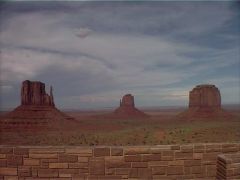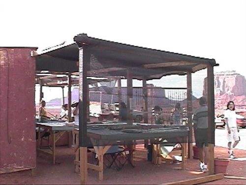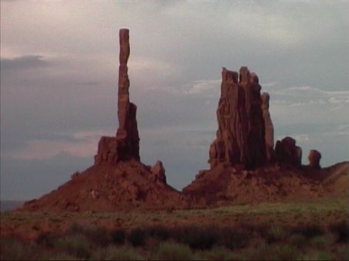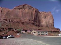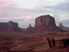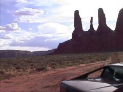 ビジターセンター"Visitor Center"*** Larry ***ついにモニュメントバレーに到着。ビジターセンターからの風景。これぞ俺が求めていたものだ(感激)。今にもインディアンが馬に乗って出てきそうだ。それにしても暑い。 *** Miki *** ここから見える3つの岩は、映画「駅馬車」でも有名。 私達のビデオには、ここで雄たけびをあげるナバホ族の声が入っている(←ウソ)
