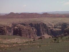 モニュメントバレー"Monument Valley"へ移動*** Larry ***グランドキャニオンの門を出て約15分、またまた面白い風景を発見!!。しかし、ここだけではなかった。 モニュメントバレーに向かう道全てが面白い。どんどんモニュメントバレーのような風景に移り変わっていく。 昼飯によったKFCでは、ナバホのお婆ちゃんがチキンを食べていた。民族衣装を着たままKFCでチキン。ぷすっ(笑) *** Miki *** 小さな村をいくつか通過しながらドライブ。 途中、竜巻が発生するところを見た!細いホソイ雲が、スーッと上の大きな黒い雲に伸びていった。 あと、丸まったワラがコロコロと転がっていたり。まさに西部劇の世界。